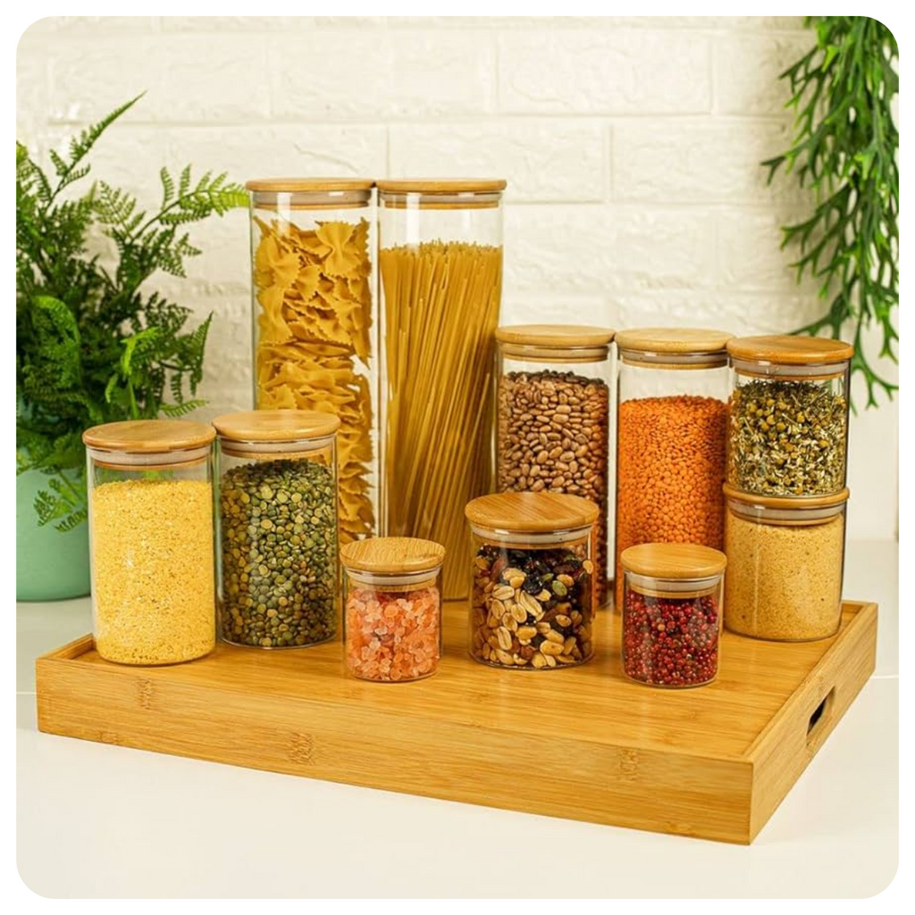 Esse é o conjunto de potes de vidro hermético mais lindo para guardar seus mantimentos com tampa de bambu!