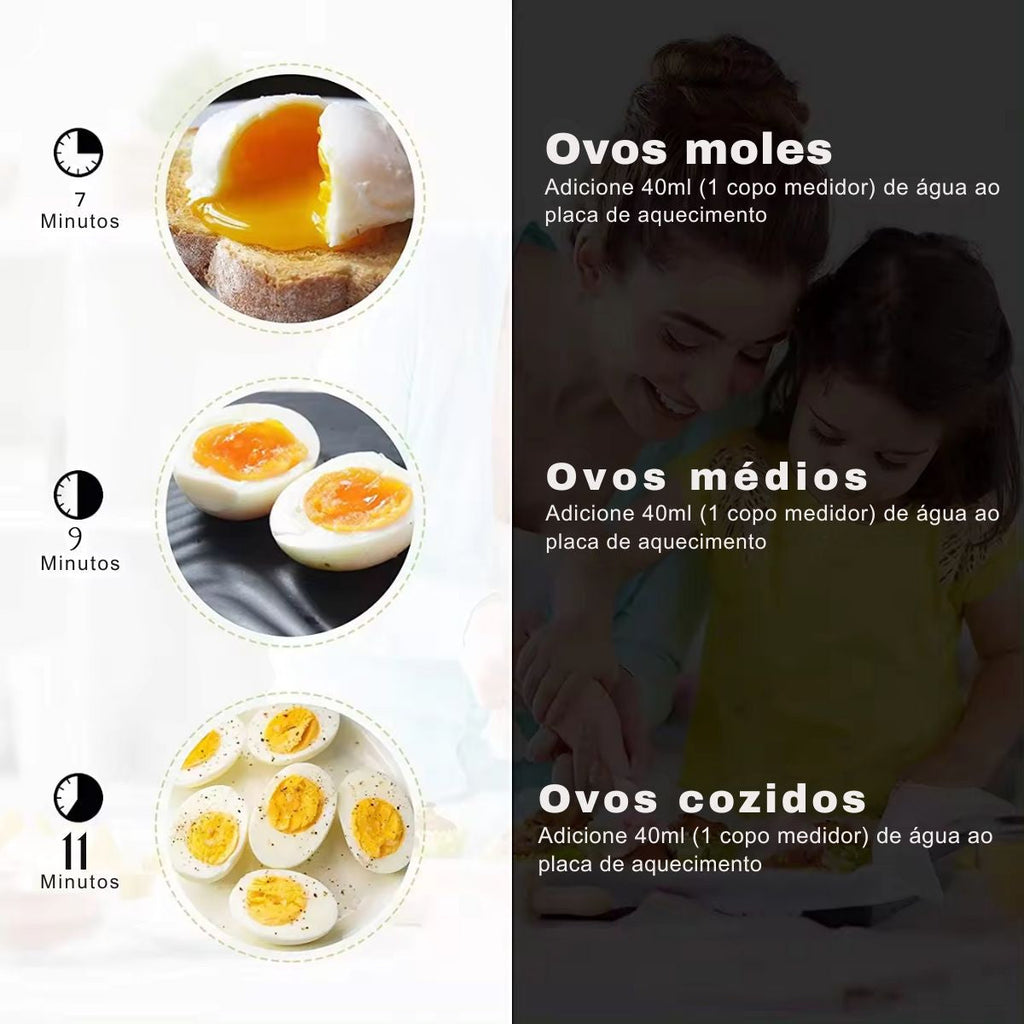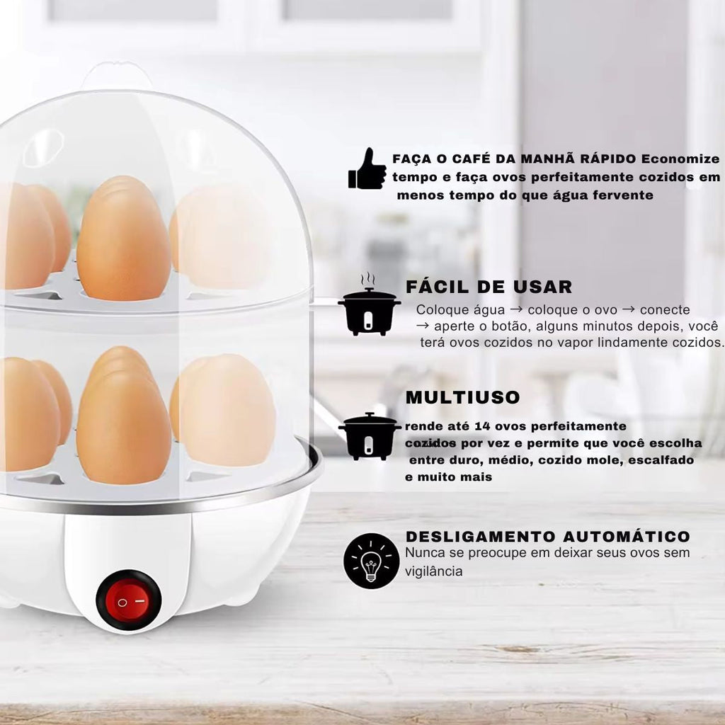 Projetado para cozinhar até 21 ovos ao mesmo tempo de de maneira eficiente e com qualidade, inclusive podendo escolher o ponto desejado do ovo, que variará de acordo com a quantidade de água colocada no reservatório (mole, macio, bem cozido).