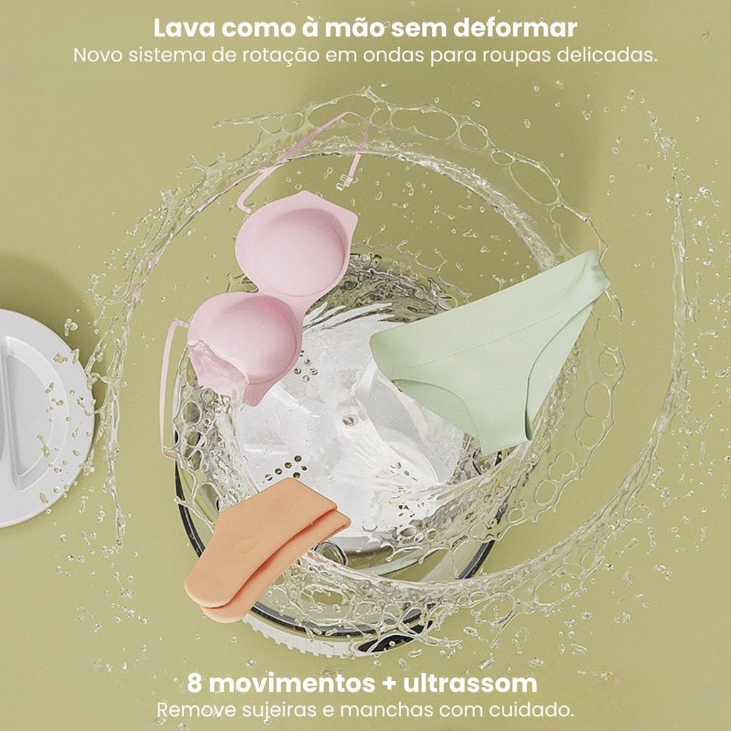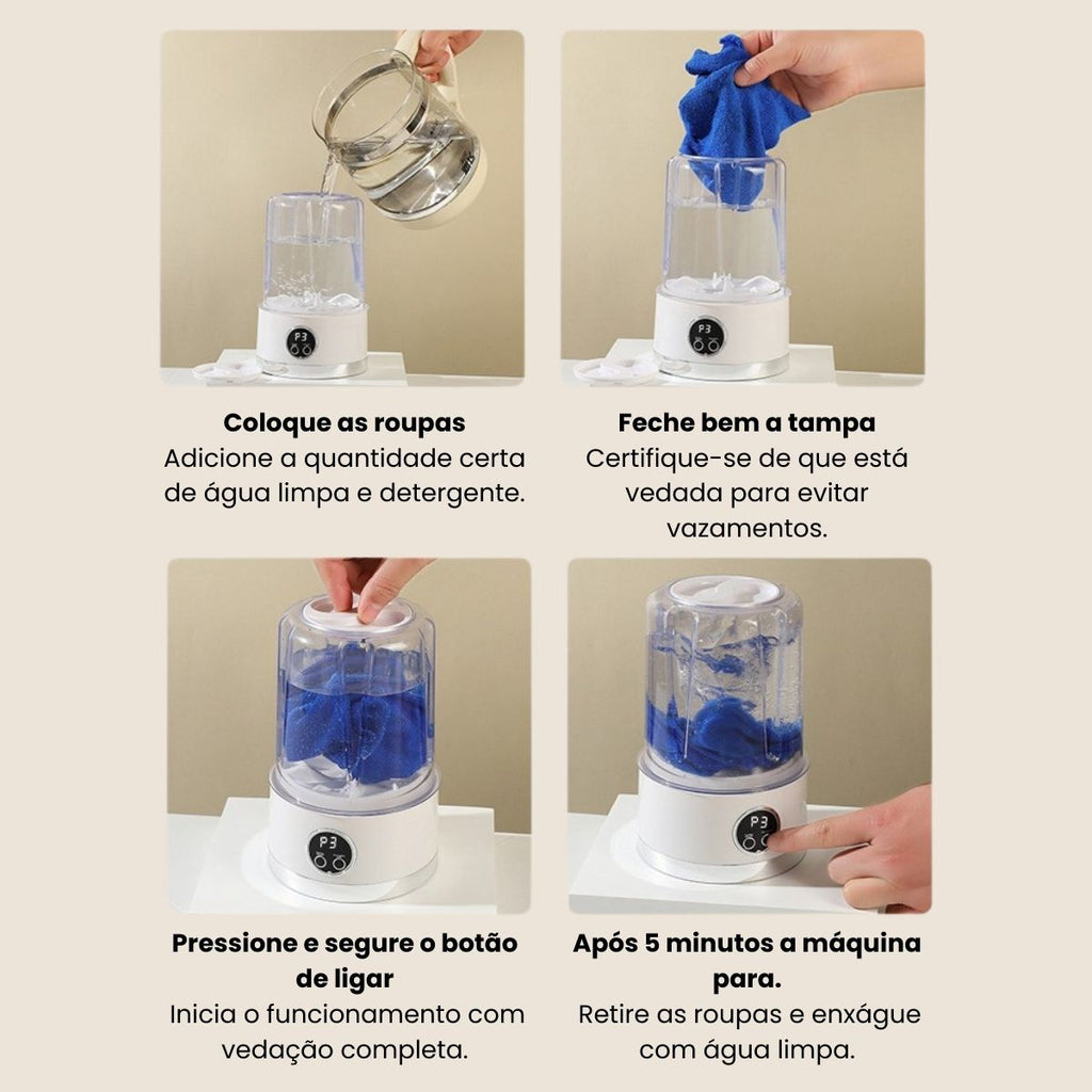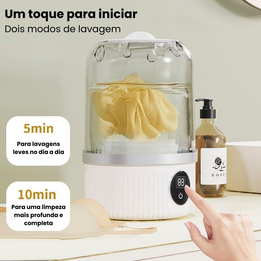 Com design leve e fácil de usar, basta adicionar água, sabão e ligar o ciclo. Econômica, consome pouca energia e água, além de ser portátil, podendo ser usada em qualquer cantinho da casa ou até levada em viagens.