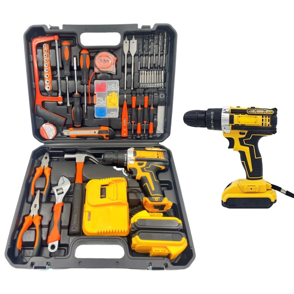O kit acompanha uma maleta resistente e organizada, recheada de ferramentas e acessórios essenciais para perfuração, montagem e pequenos reparos do dia a dia.